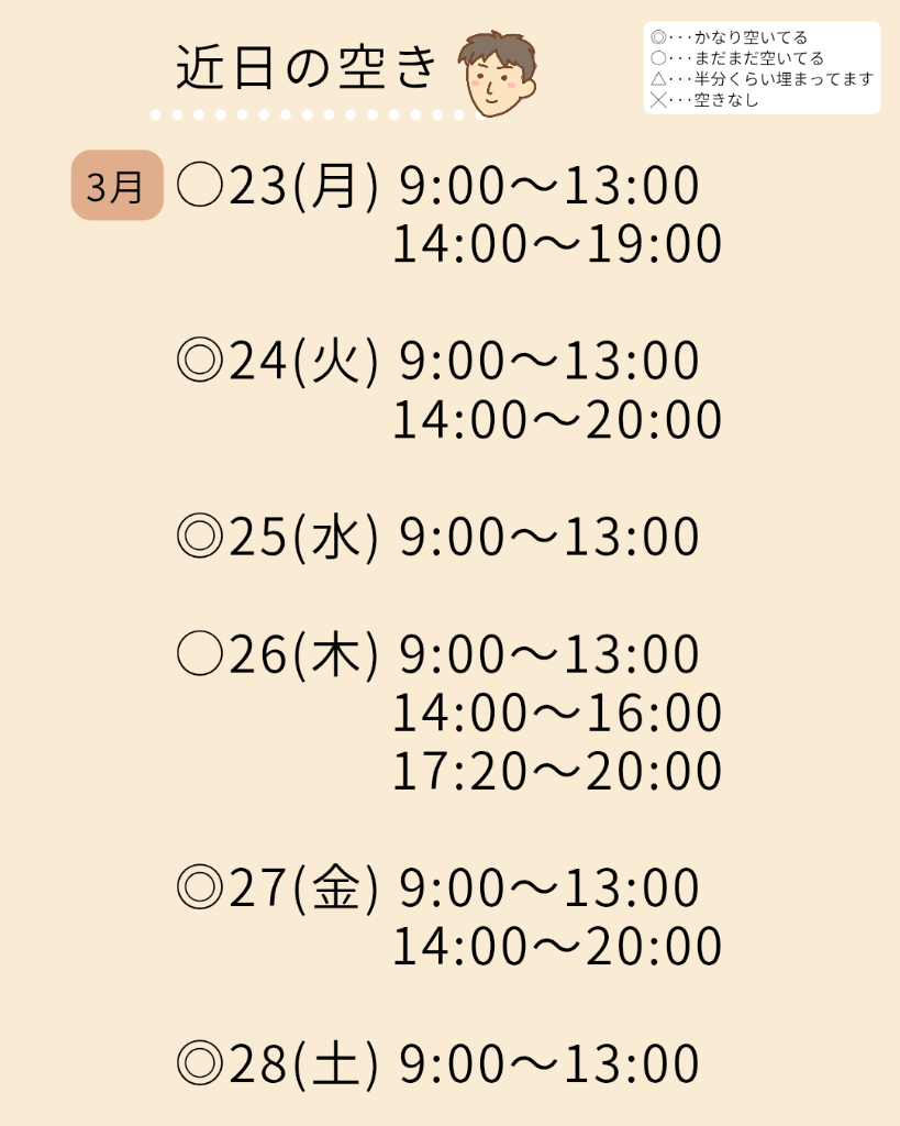 3/20(金、祝)はCLOSEが少し早く、9:00~13:00、14:00~18:00となります。