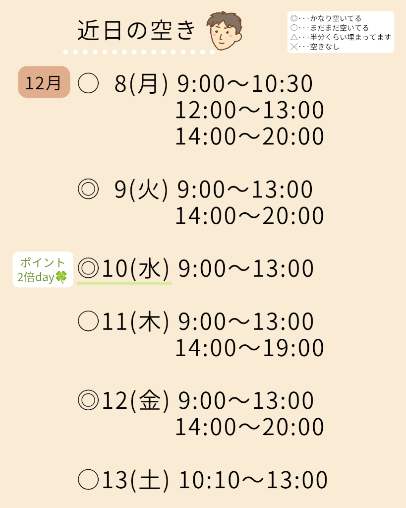 (急遽お休みとなった場合は個別にご連絡いたします。)