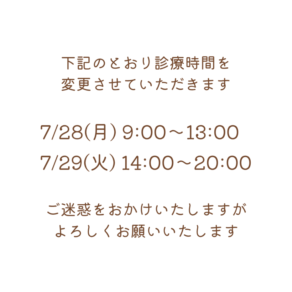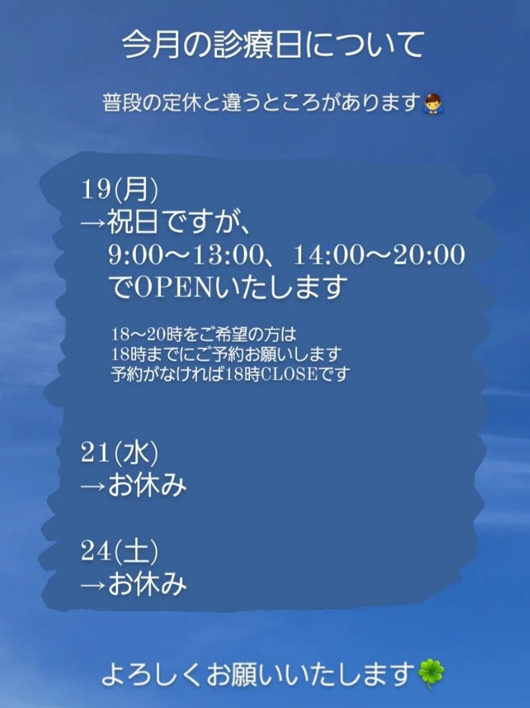 7/21(月、祝)はCLOSEが少し早く、9:00~13:00、14:00~18:00となります。