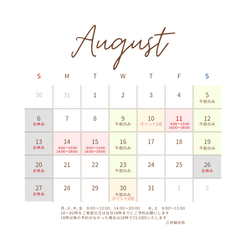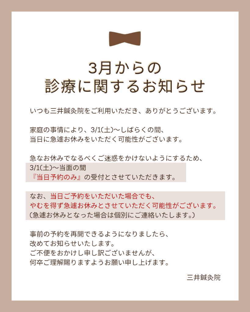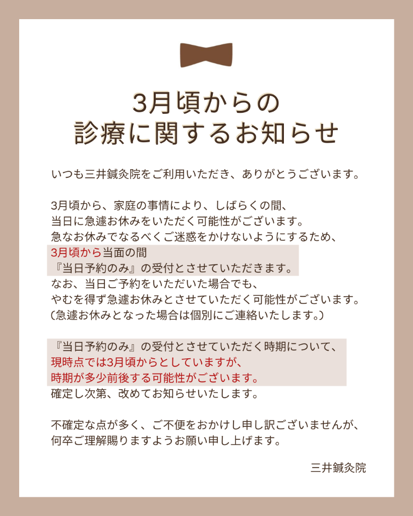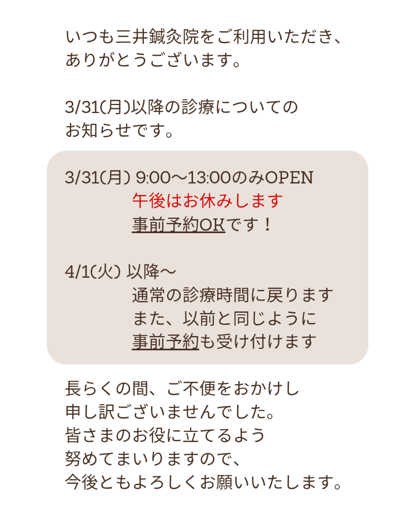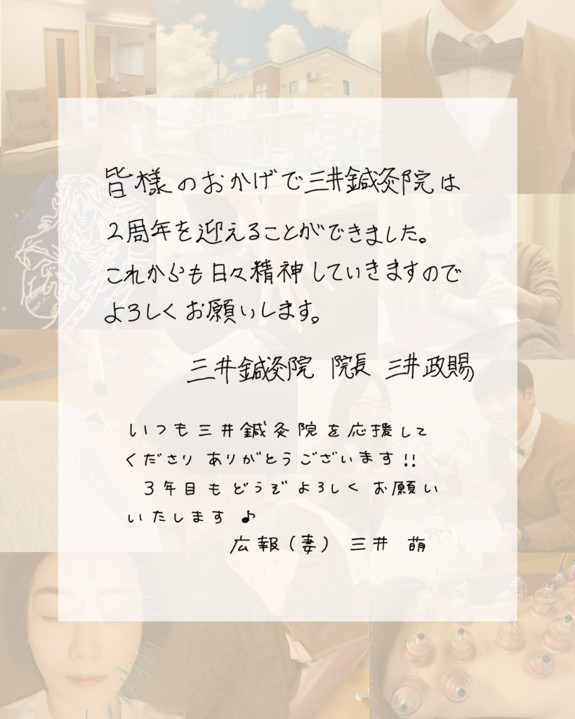 いつも三井鍼灸院をご利用いただき、ありがとうございます。