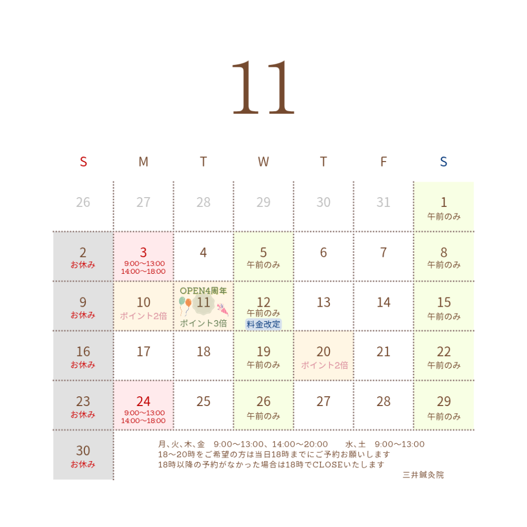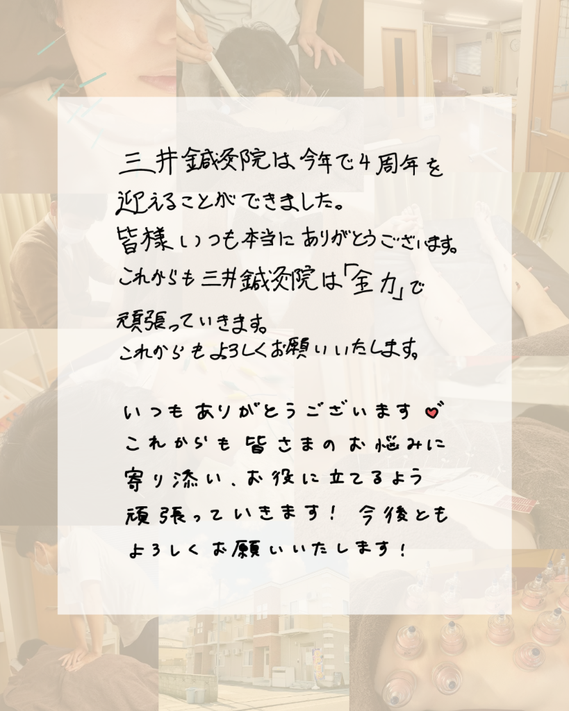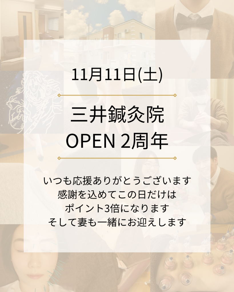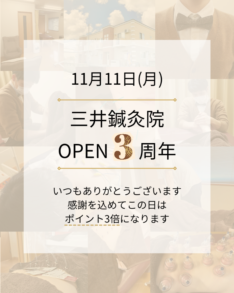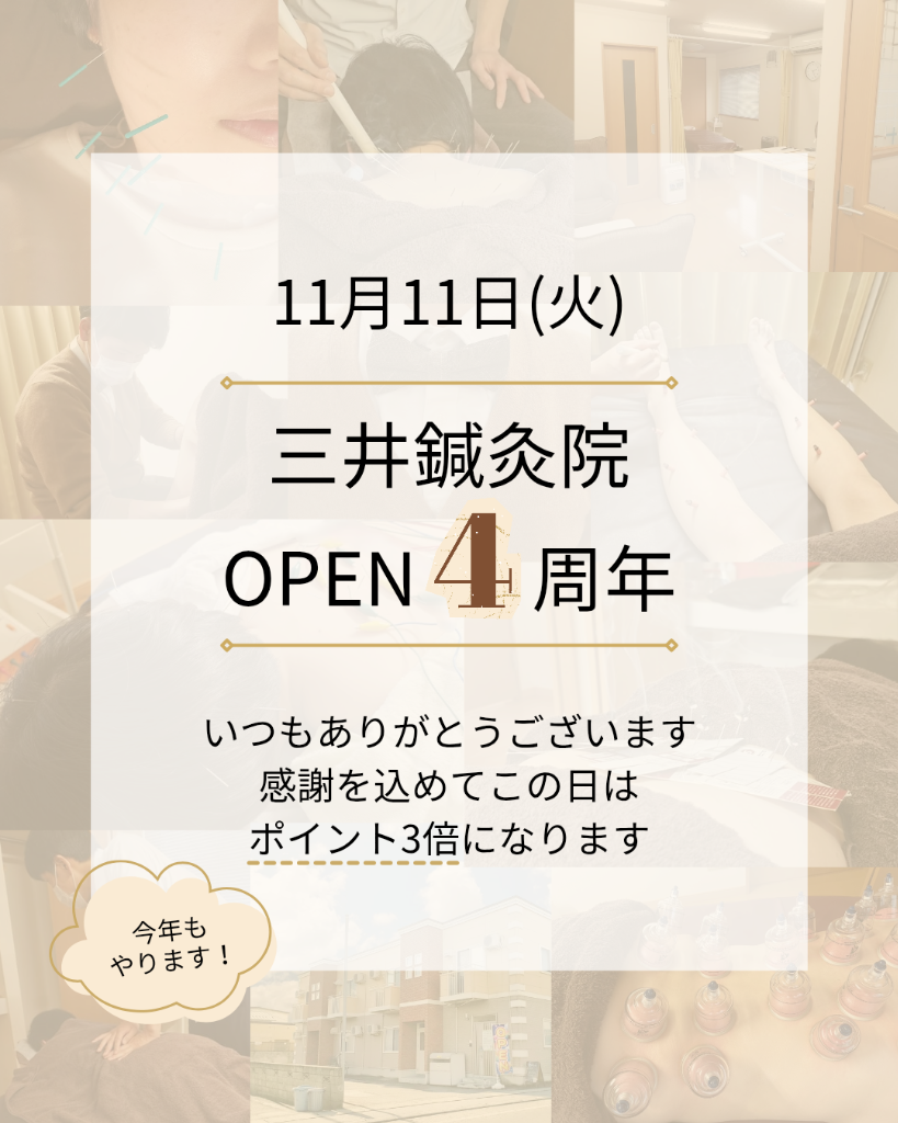 なお、改定前日の11月11日(火)は、三井鍼灸院のOPEN4周年です。