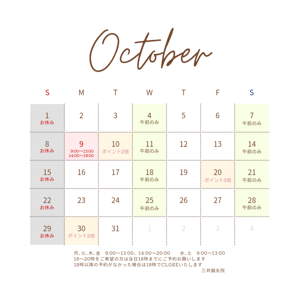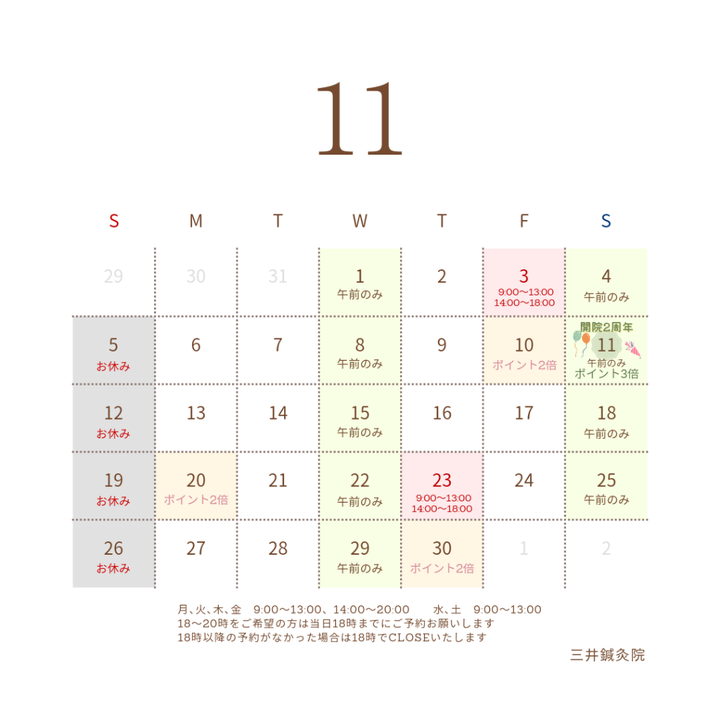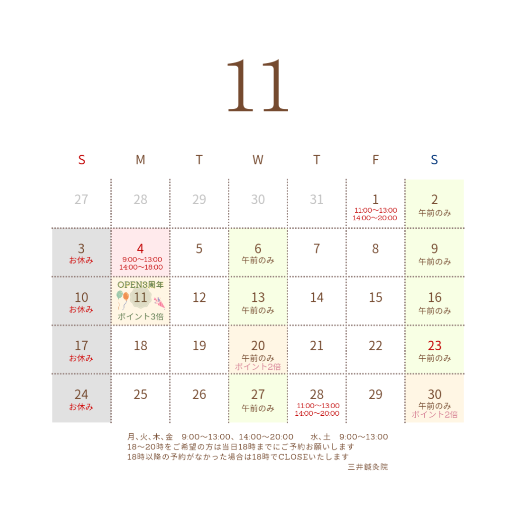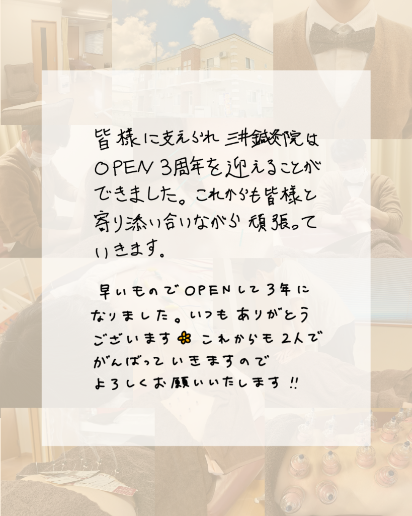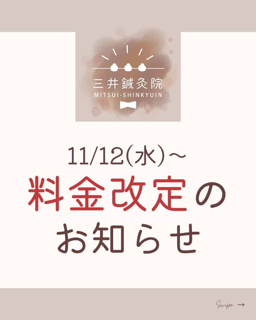 なお、改定前日の11月11日(火)は、三井鍼灸院のOPEN4周年です。