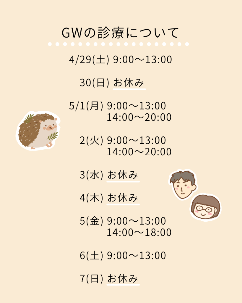 4/29(火、祝)はCLOSEが少し早く、9:00~13:00、14:00~18:00となります。