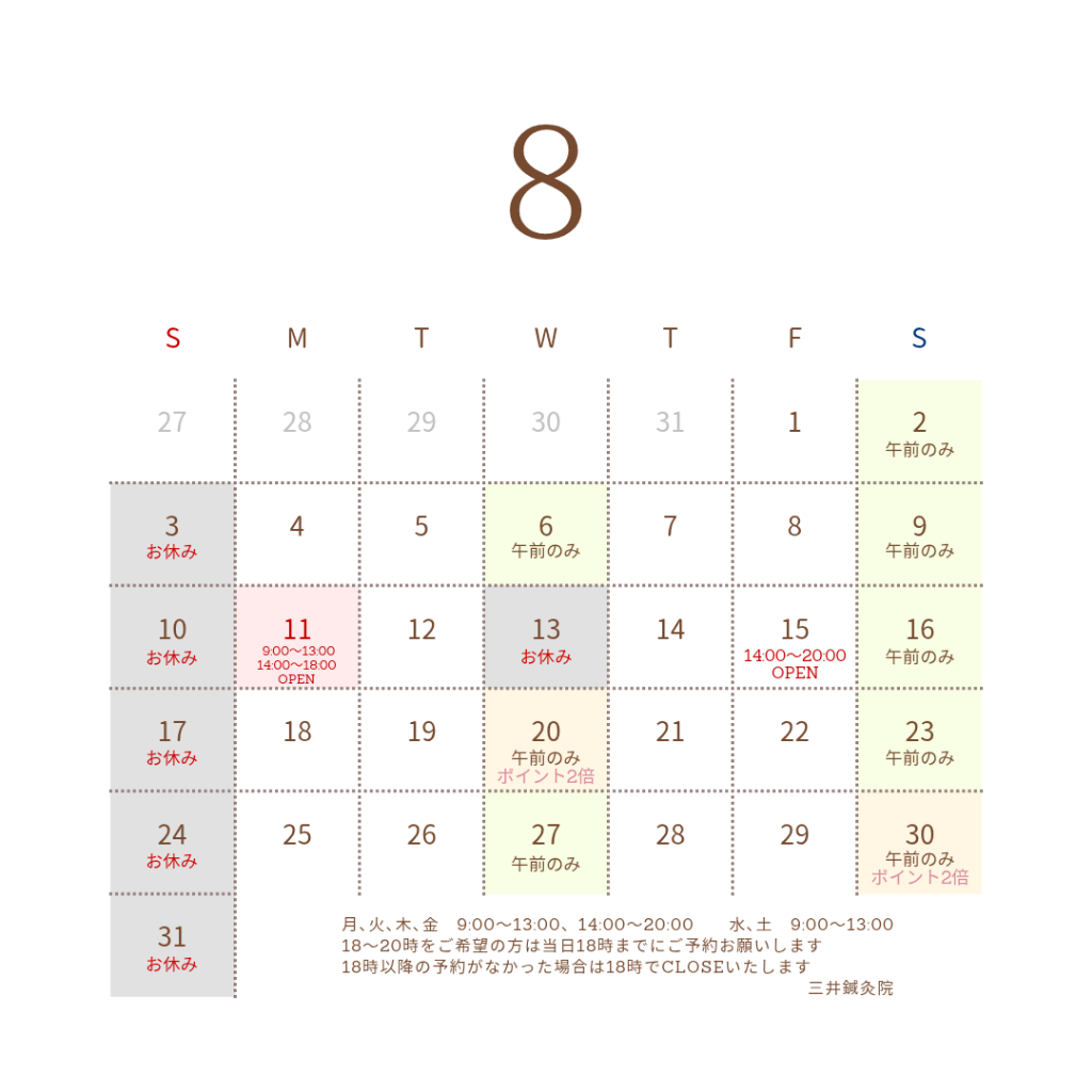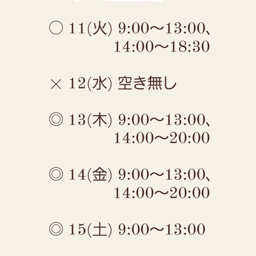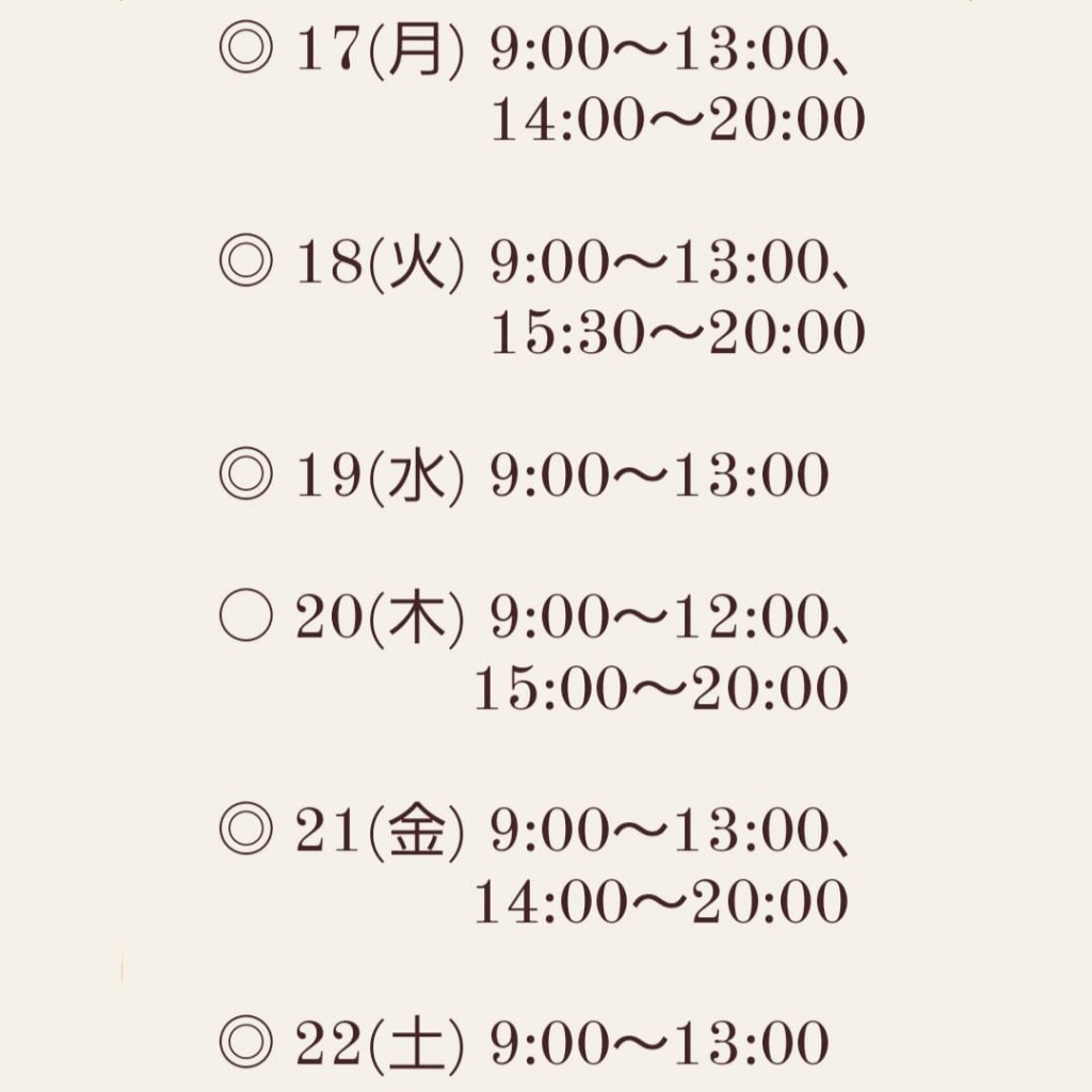 8/11(月、祝)はCLOSEが少し早く、9:00~13:00、14:00~18:00となります。