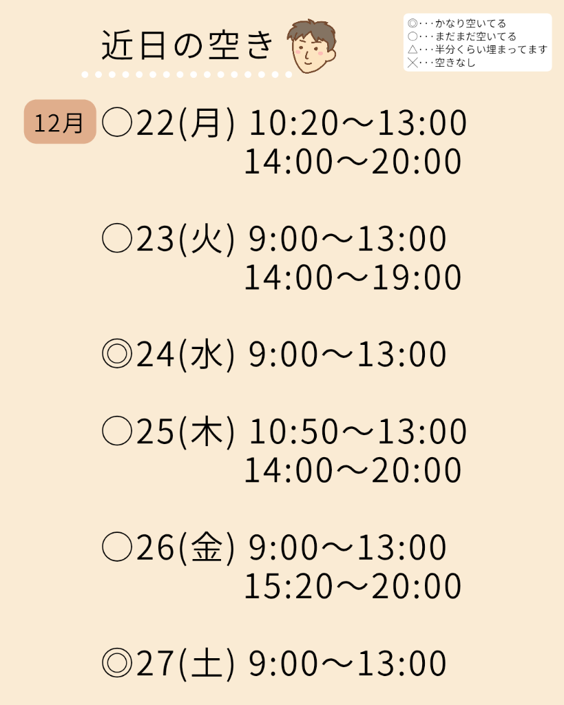 (急遽お休みとなった場合は個別にご連絡いたします。)