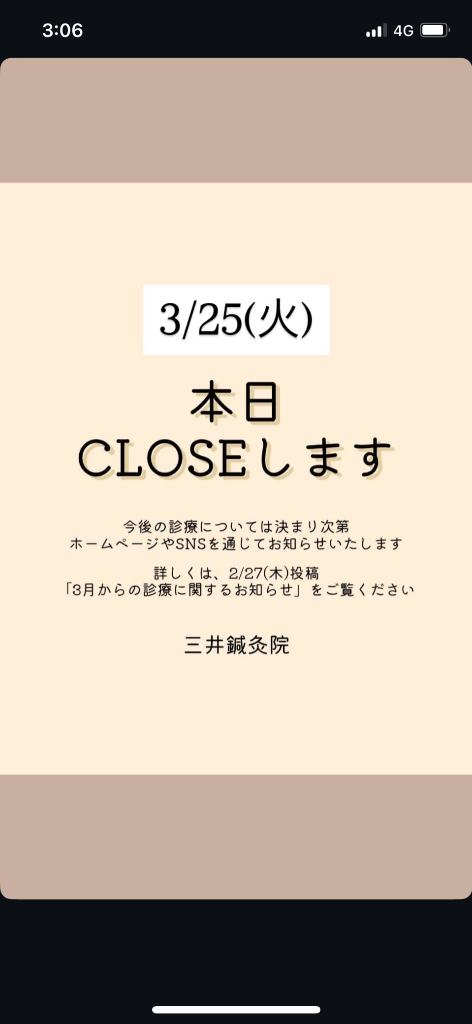 本日、3/25(火)CLOSEさせていただきます。ご迷惑をかけて申し訳ございません。