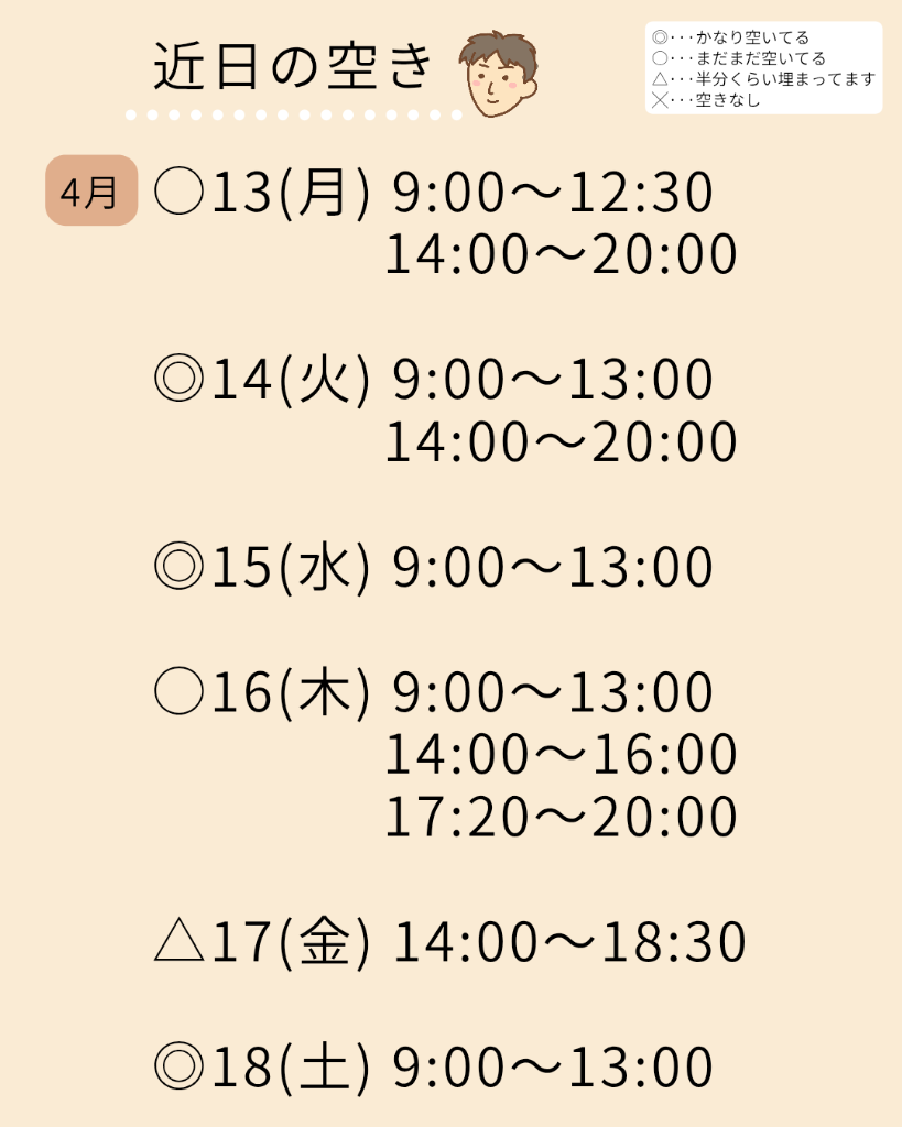 9:00〜13:00/14:00〜18:00 の診療となります。